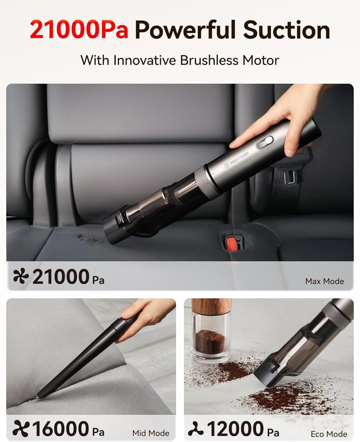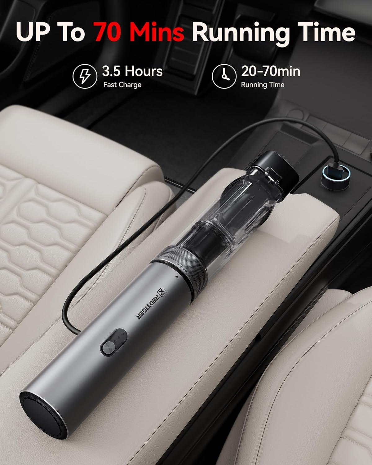 REDTIGER Car Vacuum Cordless, 21000PA Portable Handheld Vacuum Up to 70 Mins Runtime, 3.5H USB-C Fast Charge, Lightweight 4 in1 Mini Hand Held Cleaner Power for Car Home Outdoor Camp Pet Food Black